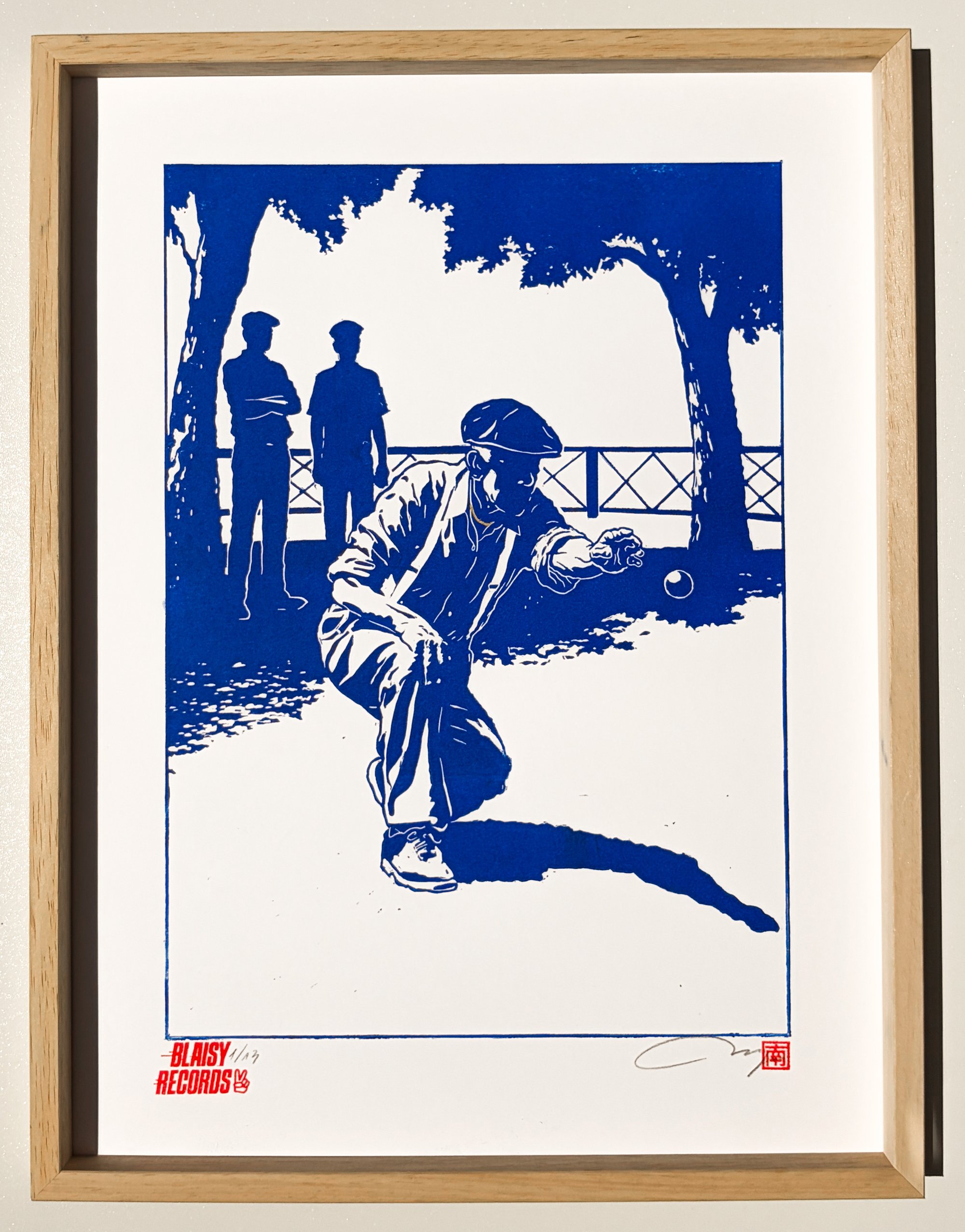 En collaboration avec Blaizy Records. Linogravure à l'encre à l'huile sur papier japonais 30x40 cm de 225g. Édition de 13. Encadrement chêne clair.